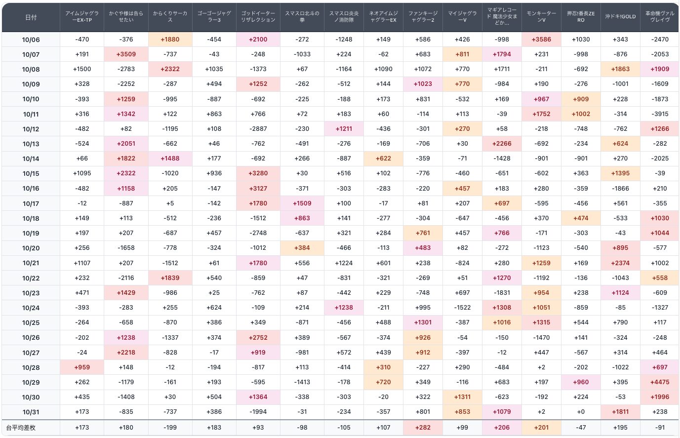差枚数でサクッと分析したところ、トータルではファンキー、マギレコ、モンキーあたりが強そうです。(一番下の行の色がついてるところ)