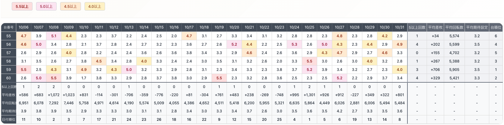 表の一番右側の列が期待できる台のランキングになります!