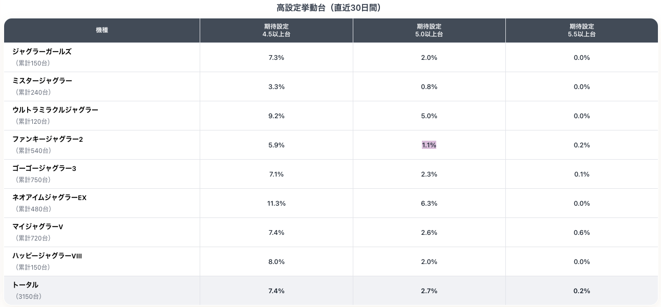 これを見てみると、ファンキーは期待設定が5以上の台の割合はかなり少ないことが分かります。