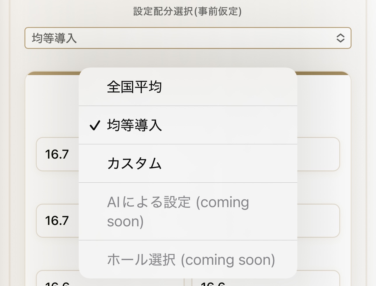 - AIによる設定:読み込んだ数値からAIが自動で配分を逆算(開発中のため選択不可)