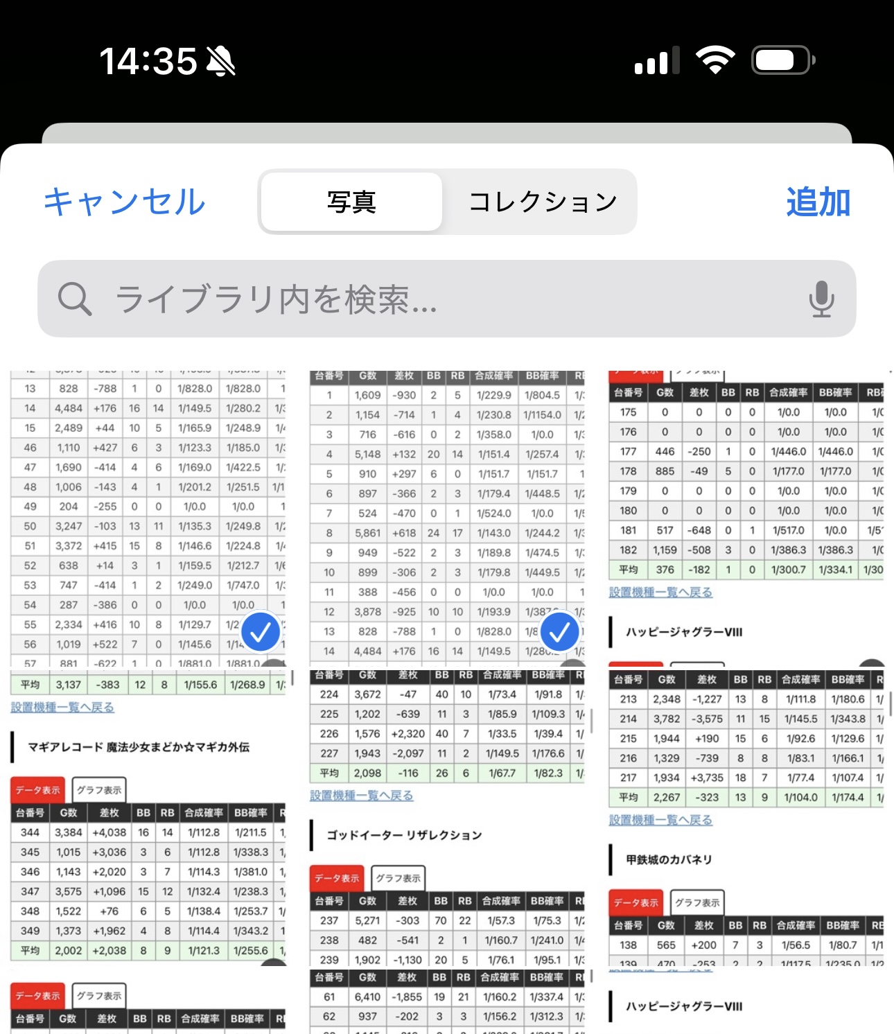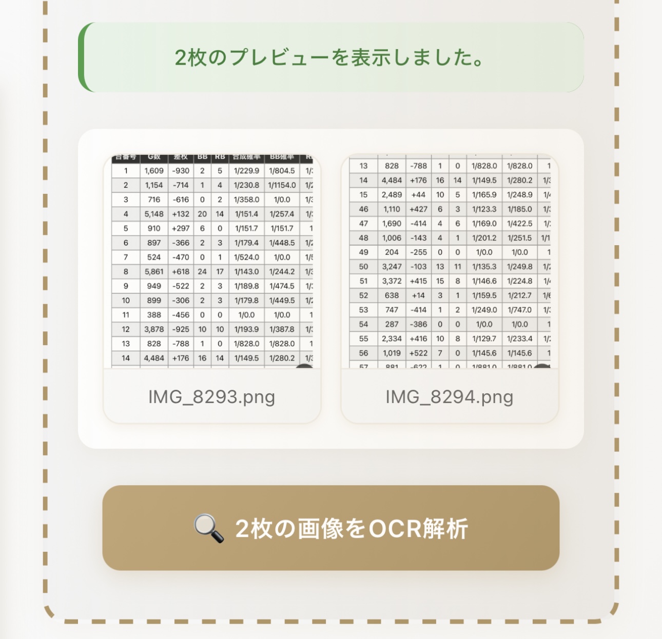 - 4枚まで同時に読み込むことができます。被っている台番号があっても構いません(この画像では9番から51番までが両方の画像に入っているが問題なし)。