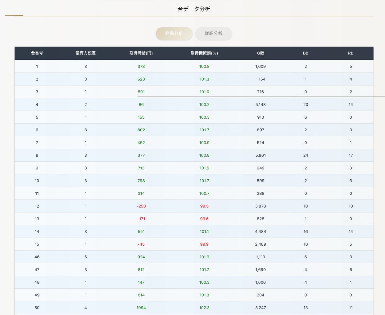 - 期待設定:各設定の期待度(%)から計算した設定の期待値