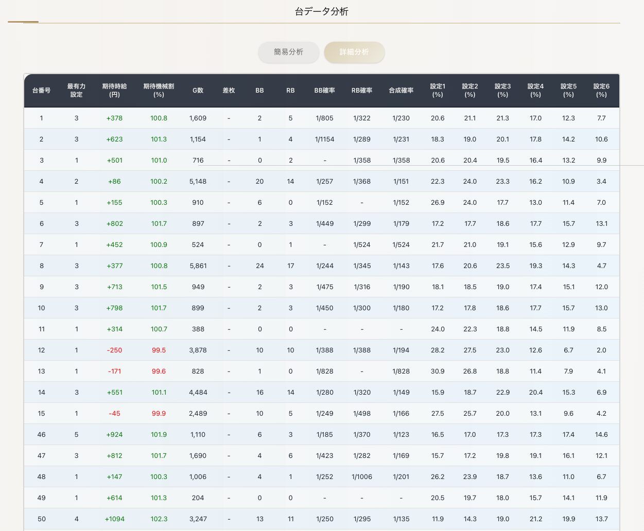 - 期待機械割:各設定の期待度から算出した機械割の期待値(機械割はメーカー公表値)