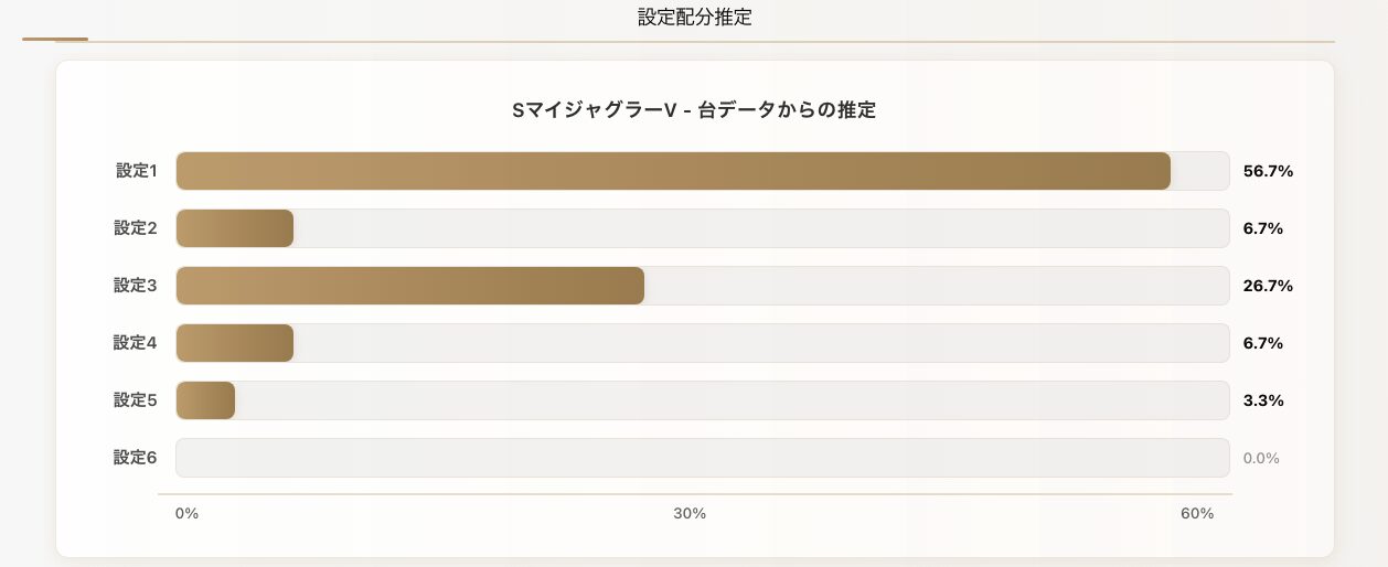 - 最有力設定:各最有力設定の台数の分布(例:合計10台の読み込みで最有力設定1の台数が3台→30%)
