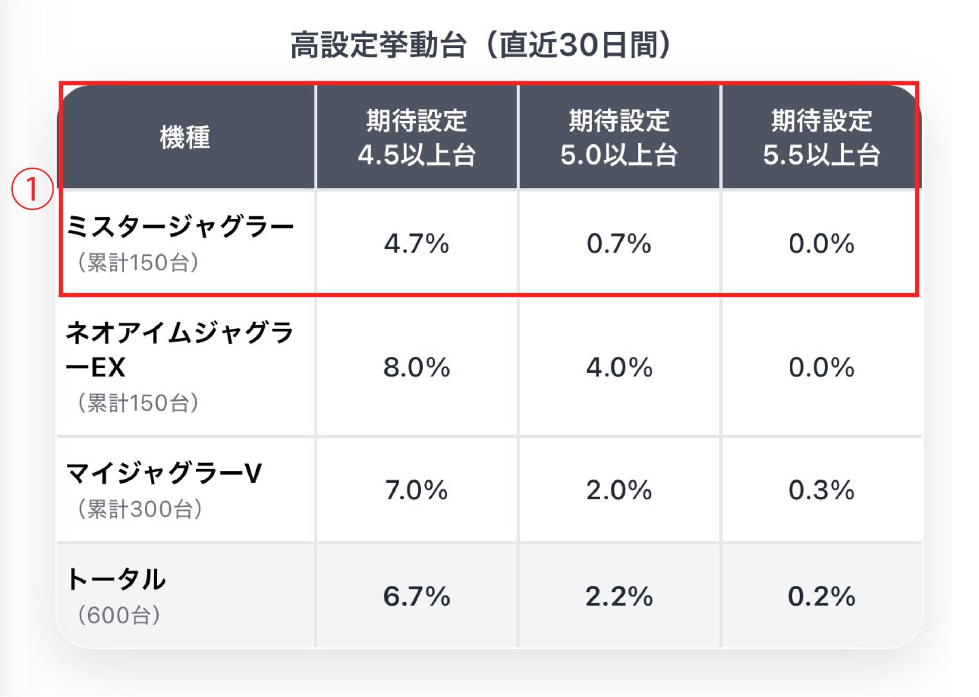 この表では、ミスタージャグラーは過去30日間で設定1は約58台(38.7%)使用されたということが推定されます。