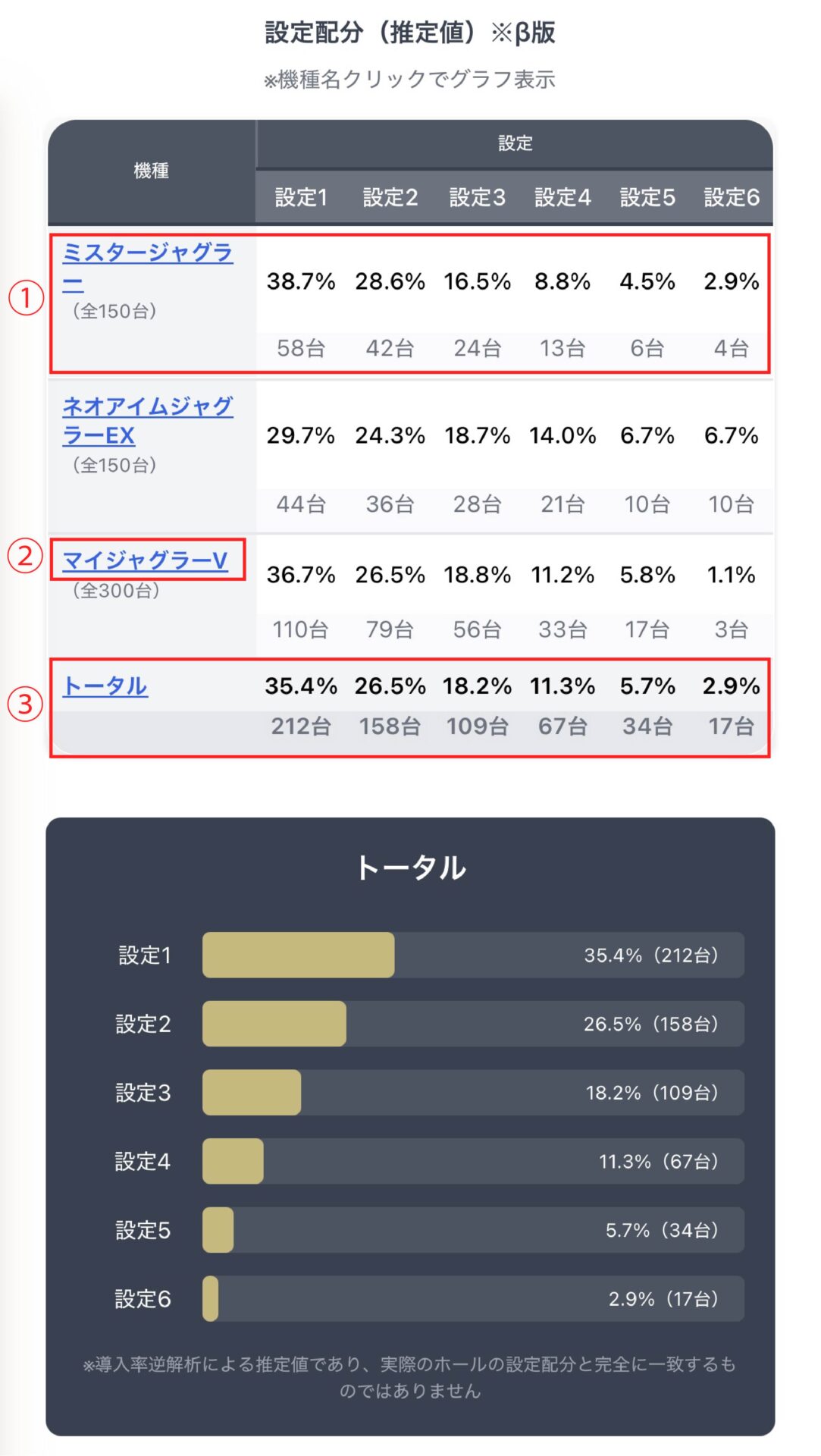 店がどの機種に高設定を使用しているのかを数字で把握することができます!