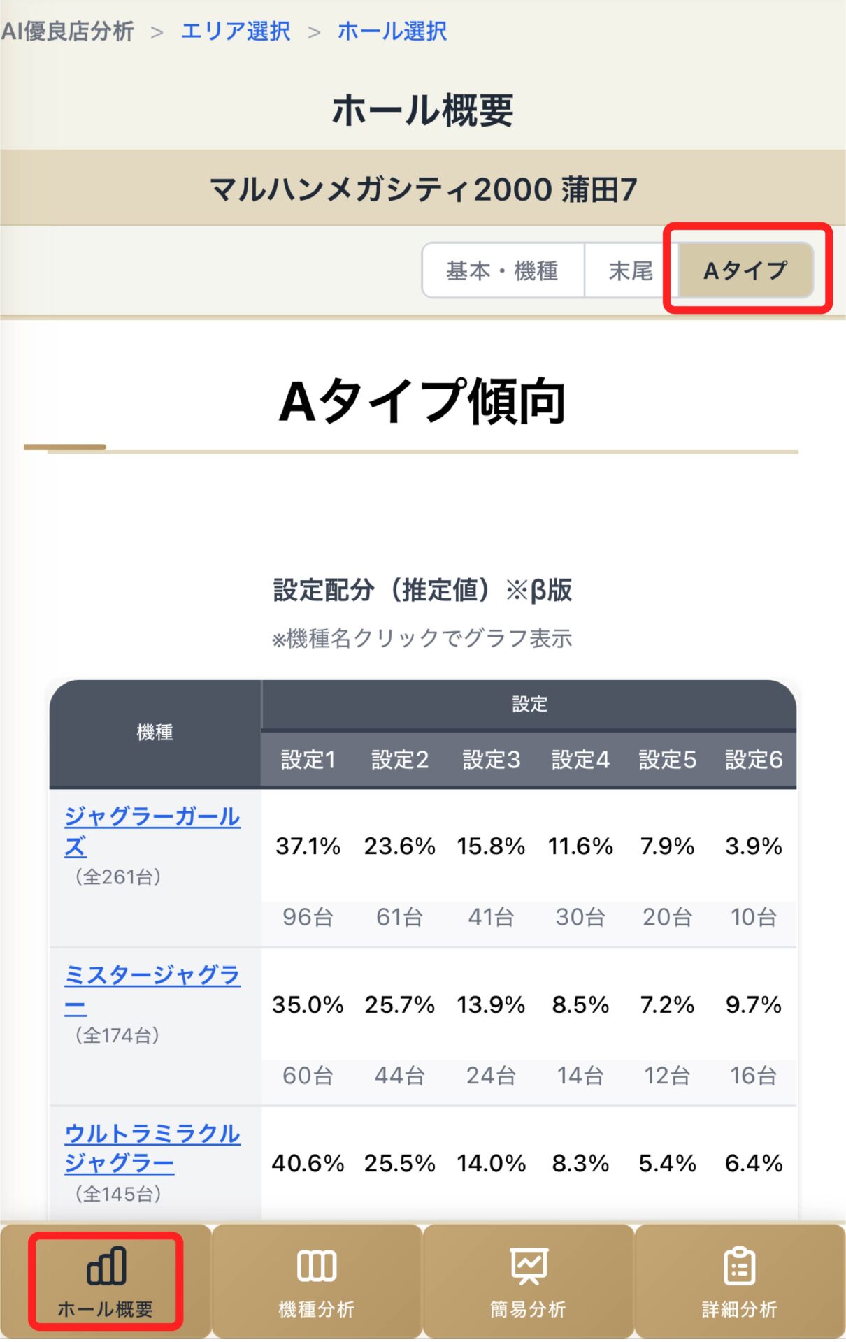 店全体でAタイプにどの程度高設定が使われているかをざっくり把握できます。