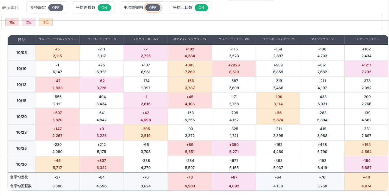 - 平均差枚数:該当日の全台平均の差枚数